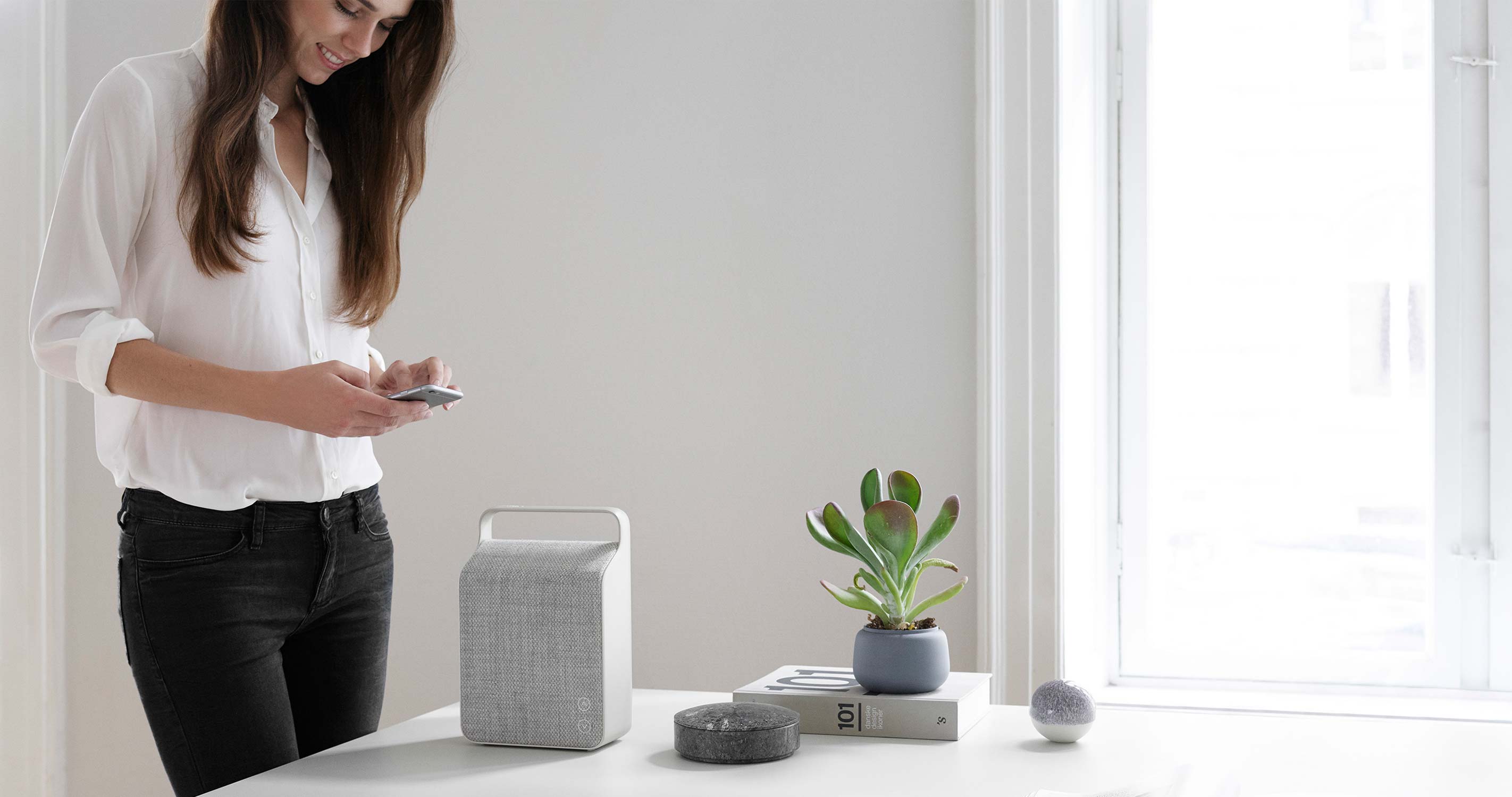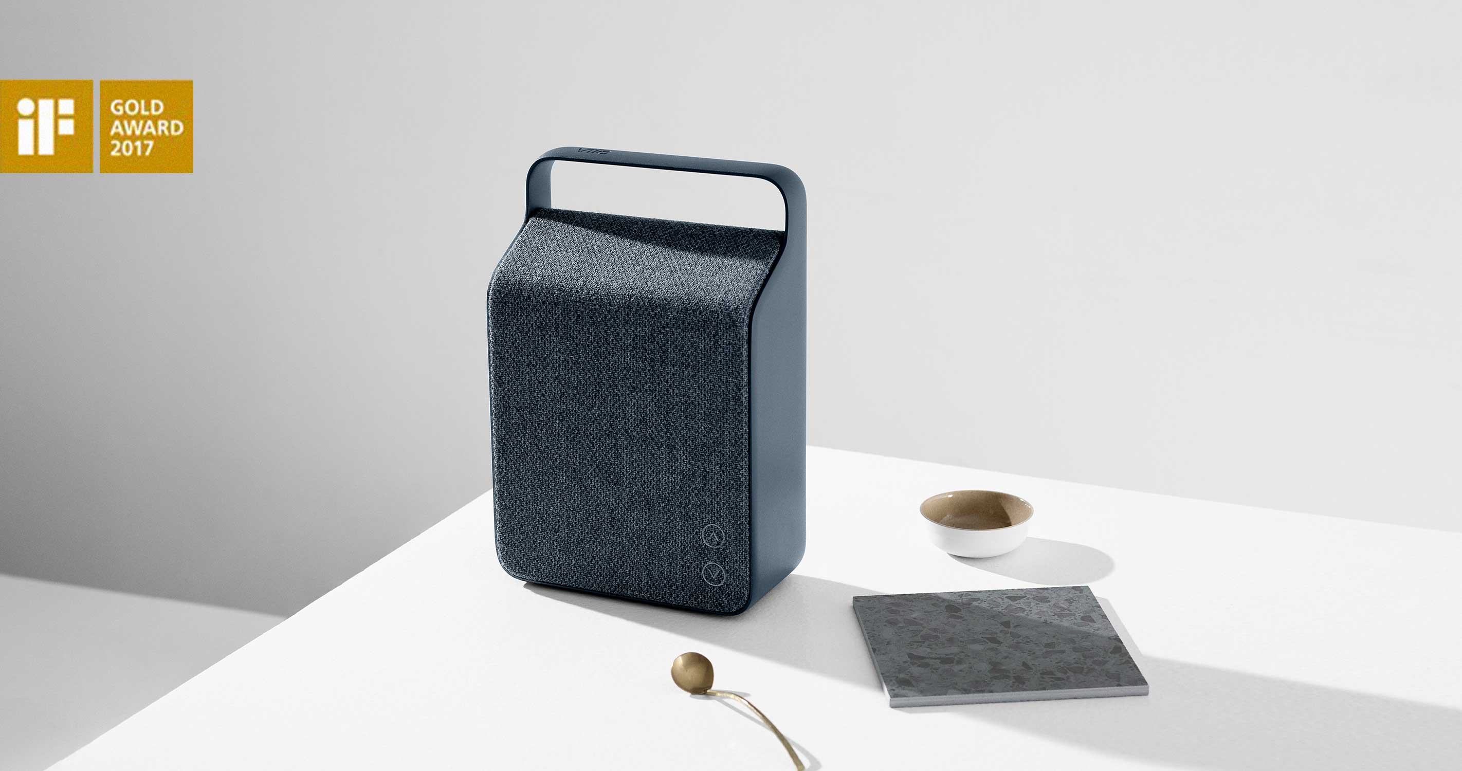 "The Danish-designed Vifa Oslo is a gorgeously appointed Bluetooth speaker that will look great in your living room: the perfect link between technology, sound quality and long-lasting design. The soft and well-formed handle extends in a single stroke from the speaker body, while upholstery-grade fabric covers the rest of the unit. The interface is hidden. Nothing more and nothing less!"