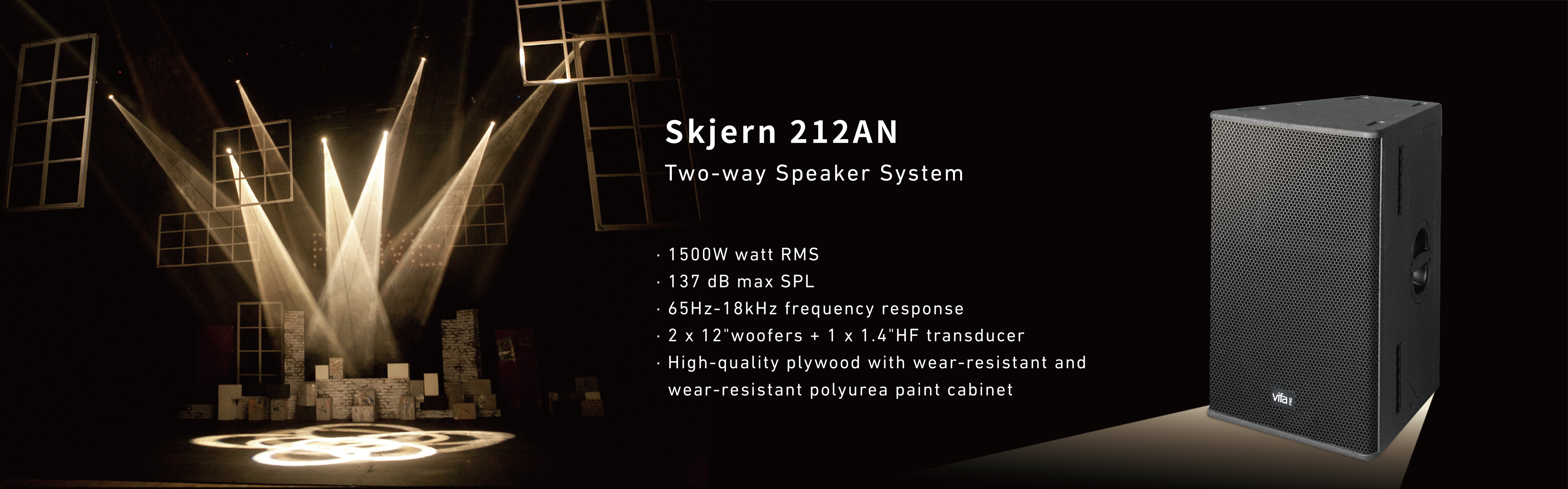 Skjern 212AN, a dual 12-inch high-power loudspeaker with high sensitivity and high SPL characteristics, is equipped with a long-stroke design that combines horn-loaded bass/midrange and high-frequency drivers to deliver deep and clear sound. The unit configuration consists of 2 x 12-inch high-efficiency neodymium mid-woofers and 1 x 1.4-inch exit-throat 75mm voice coil neodymium high-frequency driver. The cabinet is made of multi-layer composite plywood and coated with wear-resistant polyurea paint to ensure durability. A dual-channel digital amplifier with built-in DSP brings precise audio processing power to the Skjern 212AN.