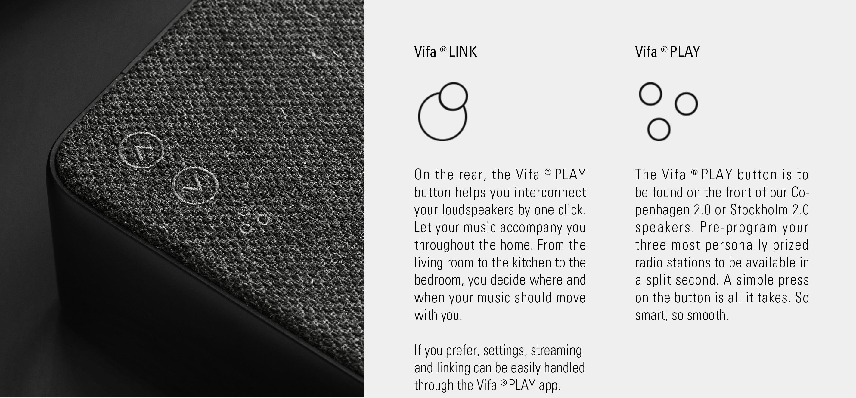 If you prefer, your settings, streaming and linking within the new Vifa®HOME universe can also be managed through the Vifa®HOME app. This free app permits an instant overview of music in your home. You can handle your favourite streaming-service: Spotify, QQ Music or TuneIn. You can group your Vifa loudspeakers, right there from your screen. Unbelievably simple and surprisingly smooth, you’re always in control of setting the proper ambiance in any room - right from your phone.